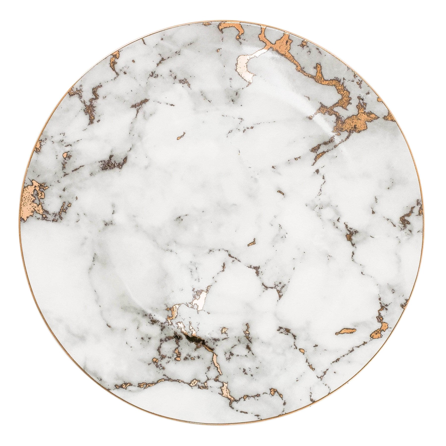 Bring a touch of European elegance to your table with the Michaelangelo marble plate collection . This refined porcelain dinner set combines an artistic marble pattern with subtle gold inlay , giving any dinner a luxurious look. Perfect for desserts, salads, steak, snacks, or cakes, these plates add a touch of class to any meal.